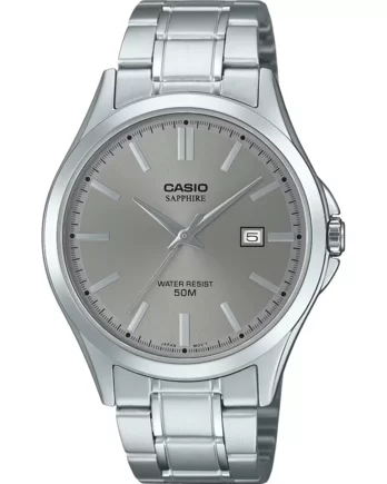 Часы Casio (Касио) практичные часы для стильных мужчин, которые ценят комфорт и практичность. На данной модели отображается текущая дата. Циферблат с метками в виде штрихов. Корпус и браслет выполнен из нержавеющей стали. Сапфировое стекло устойчивое к царапанию. Заводная головка с защитой. Браслет с тройной раскладывающейся застежкой, расстегиваемой одним касанием. Водозащита 50WR.