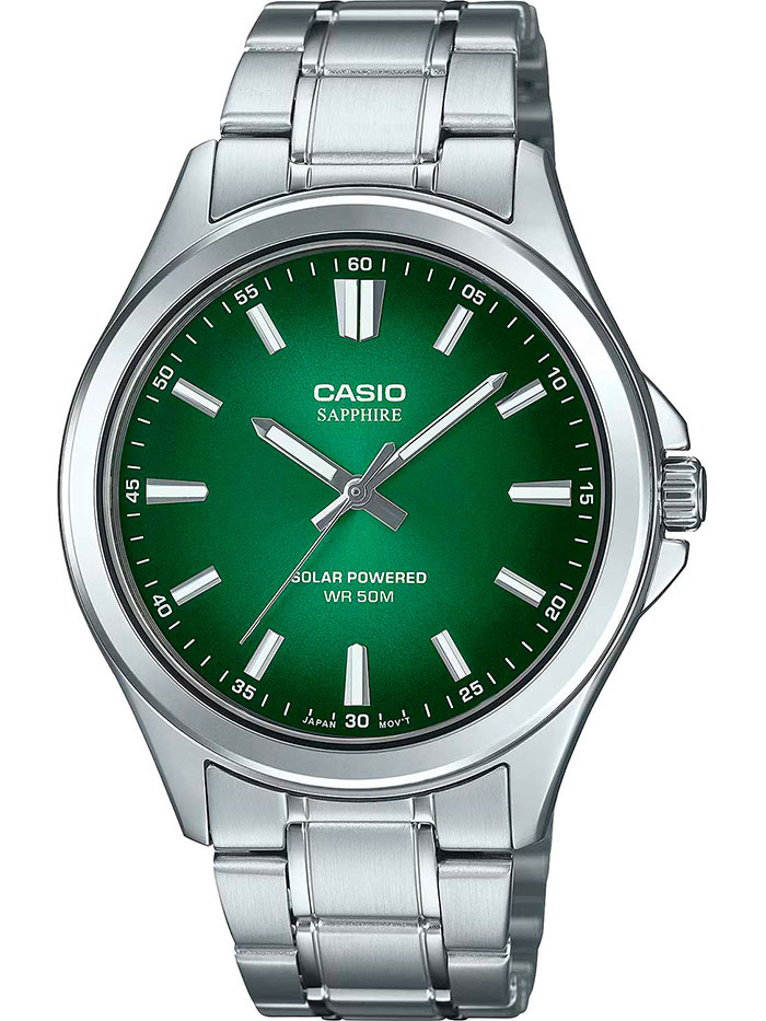 Часы Casio (Касио) практичные часы для стильных мужчин, которые ценят комфорт и практичность. Солнечная подзаряжающаяся батарейка обеспечивает питание часов для работы. Аккумулятор данной модели заряжается от любого источника света. Циферблат с метками в виде штрихов. На стрелки и метки нанесен накапливающий свет флуоресцирующий материал, за счет которого обеспечивается свечение стрелок в темноте. Корпус и браслет выполнен из нержавеющей стали. Сапфировое стекло устойчивое к царапанию. Заводная головка с защитой. Браслет с тройной раскладывающейся застежкой, расстегиваемой одним касанием. Водозащита 50WR.