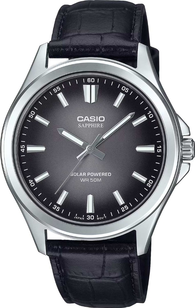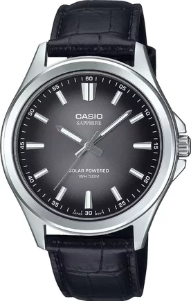 Часы Casio (Касио) практичные часы для стильных мужчин, которые ценят комфорт и практичность. Солнечная подзаряжающаяся батарейка обеспечивает питание часов для работы. Аккумулятор данной модели заряжается от любого источника света. Циферблат с метками в виде штрихов. На стрелки и метки нанесен накапливающий свет флуоресцирующий материал, за счет которого обеспечивается свечение стрелок в темноте. Корпус из нержавеющей стали.Ремешок изготовлен из кожи. Гибкость такого ремешка позволяет точно регулировать посадку часов на руке. Сапфировое стекло устойчивое к царапанию. Заводная головка с защитой. Браслет с тройной раскладывающейся застежкой, расстегиваемой одним касанием. Водозащита 50WR.
