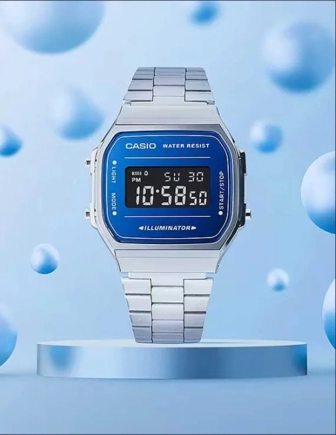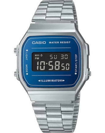 Оригинальные наручные часы Casio Vintage A-168 (Касио винтаж). Прекрасно подойдут как для мужской, так и для женской руки. Дизайн корпуса соответствует ретро-стилю и напоминает первые электронные часы. Электролюминесцентная подсветка. Отображение часов, минут и секунд. Формат времени 12/24-часовой. Автоматический календарь учитывает количество дней в месяцах, включая 28 в феврале. Отображение даты и дня недели и месяца. Секундомер с точностью измерений 1/100 сек. Ежедневный будильник, устанавливаемый на определенное время, ежечасный сигнал. Корпус из твердого и долговечного пластика с хромированным или золотистым гальваническим покрытием. Браслет со звеньями из нержавеющей стали, регулируемая по длине, застежка с защелкой. Водозащита 30WR.
