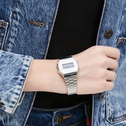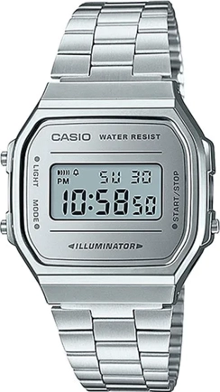 Оригинальные наручные часы Casio Vintage A-168 (Касио винтаж). Прекрасно подойдут как для мужской, так и для женской руки. Дизайн корпуса соответствует ретро-стилю и напоминает первые электронные часы. Электролюминесцентная подсветка. Отображение часов, минут и секунд. Формат времени 12/24-часовой. Автоматический календарь учитывает количество дней в месяцах, включая 28 в феврале. Отображение даты и дня недели и месяца. Секундомер с точностью измерений 1/100 сек. Ежедневный будильник, устанавливаемый на определенное время, ежечасный сигнал. Корпус из твердого и долговечного пластика с хромированным или золотистым гальваническим покрытием. Браслет со звеньями из нержавеющей стали, регулируемая по длине, застежка с защелкой. Водозащита 30WR.