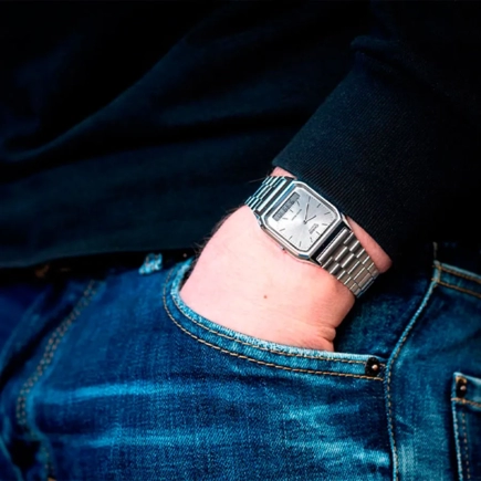 Многофункциональный календарь, отображающий число, день недели и месяц. Пластиковое стекло. Браслет стальной с регулируемой застежкой.