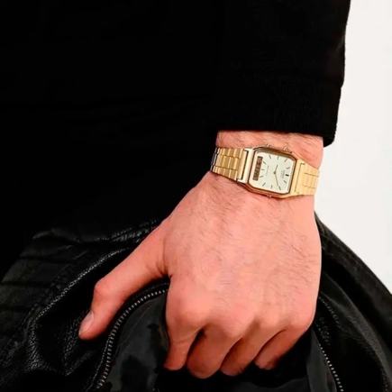 Многофункциональный календарь, отображающий число, день недели и месяц. Пластиковое стекло. Браслет стальной с регулируемой застежкой.