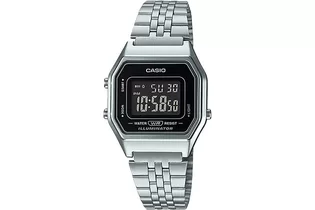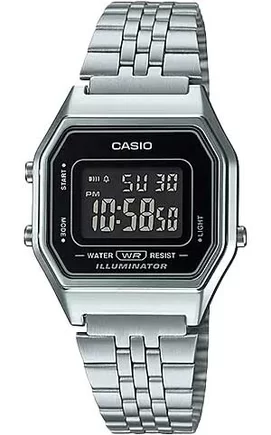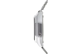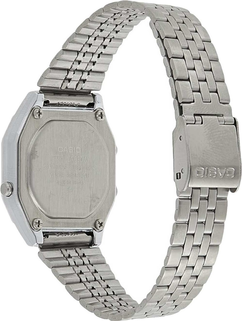 Наручные часы в стиле первых электронных моделей, предназначенные для женщин. Ретро-дизайн. Пластиковый корпус с хромированием и браслет из нерж. стали. Многофункциональный кварцевый механизм с цифровой индикацией и подсветкой.