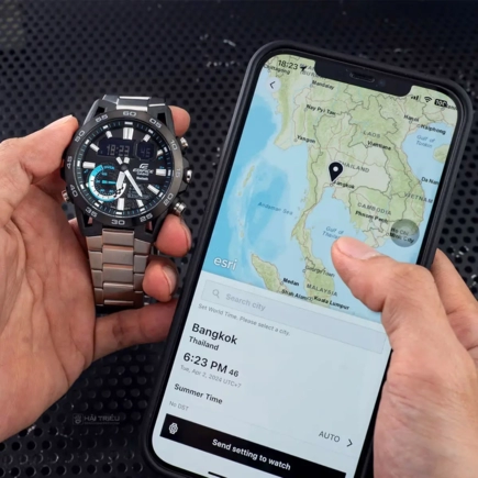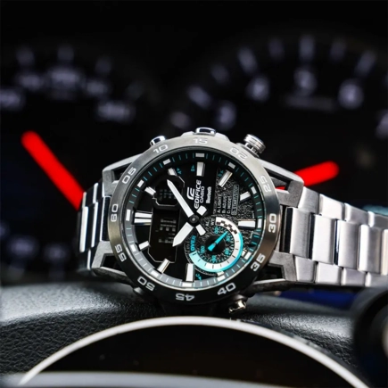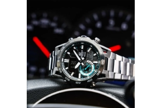 Стильная и функциональная новинка в линейке Casio Edifice (Касио Эдифис) пронизана насквозь спортом и духом скорости. Edifice Sospensione. Мужские часы, дизайн которых вдохновлен подвеской болида Формулы-1. Ушки часов разработаны по схеме четырехрычажной подвески гоночного автомобиля. Двойная подcветка: циферблат и ЖК-дисплеи подсвечиваются светодиодом, благодаря наличию функции задержки, после отпускания кнопки освещение горит еще несколько секунд. При повороте часов в сторону лица, подсветка включается автоматически. Настраиваемое послесвечение 1,5 или 3сек. Цвет подсветки: белый. Необритовое светонакопительное покрытие обеспечивает длительное послесвечение в темноте даже после кратковременного нахождения на свету. 12-ти и 24-х часовой формат времени. Секундомер с двумя точностями показаний: 1/1000с (до 1ч) и 1/10с (после 1ч) и временем измерения 24ч. SPLIT-хронограф. Память на 200 кругов. Таймер обратного отсчета от 1с до 24ч. Мировое время – 38 городов (38 часовых поясов), всемирное координированное время (UTC). Автоматический переход на зимнее и летнее время, возможность включения/отключения данной функции. Переключение между домашним и мировым временем.