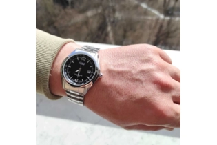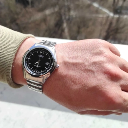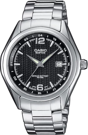 Наручные часы Casio Edifice (Касио Эдифис) со спортивным характером. Окошко даты. Корпус и браслет стальной, браслет с раскладывающейся застежкой. циферблат черный, водозащита 100WR подходит для плавания с маской, трубкой и обычного плавания. Подсветка люминесцентные стрелки и метки, стекло минеральное, устойчивое к возникновению царапин.