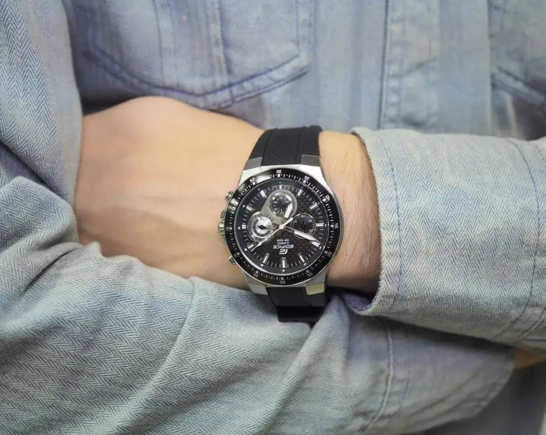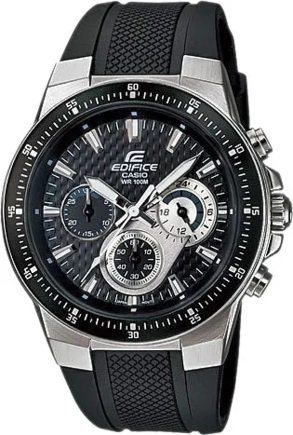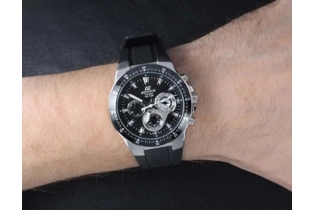 Наручные часы Casio Edifice (Касио эдифис) с хронографом в гоночном стиле - отличный выбор для покорителей трасс. Хронограф с секундомером точностью 1 сек и временем измерения 30мин. Стрелки и метки покрыты люминесцентным напылением (светятся в темноте). Задняя крышка с винтовым фиксатором. Браслет каучуковый, водонепроницаемость WR100, стекло минеральное.