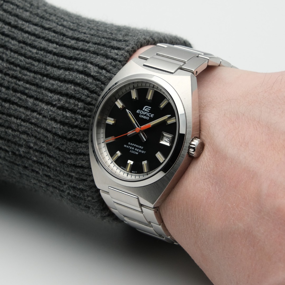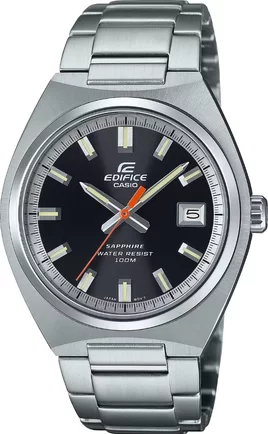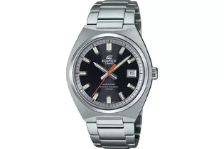 Наручные часы Casio Edifice (Касио эдифис) . Необритовое светонакопительное покрытие стрелок и меток  (светятся в темноте).На данной модели отображается дата. Сапфировое стекло с антибликовым покрытием, устойчивое к появлению царапин. Завинчивающаяся задняя крышка.  Литой браслет с тройной раскладывающейся застежкой, расстегиваемой одним касанием. Предохранительная защелка на браслете препятствует случайному расстегиванию. Водонепроницаемость WR100.
