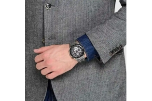 Стрелки и метки покрыты люминесцентным напылением (светятся в темноте). Циферблат с метками в виде штрихов. Часы-хронограф с секундомером точностью 1/10 сек и временем измерения 1ч. Заводная головка с защитой. Задняя крышка с винтовым фиксатором. Батарея рассчитана на 3 года. Стальной браслет с раскладывающейся застежкой. Стекло минеральное, водонепроницаемость 100WR.