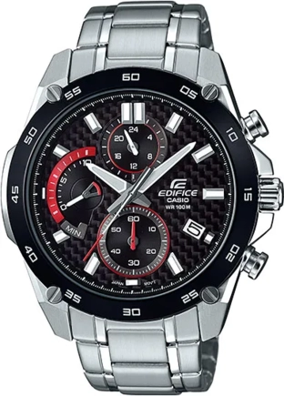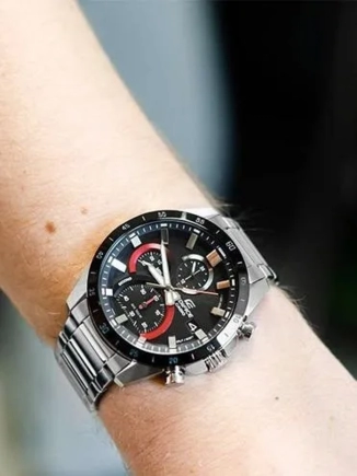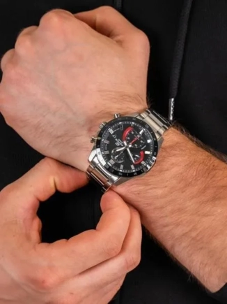 Наручные часы Casio Edifice (Касио эдифис) стильный хронограф по достоинству оценят современные мужчины. Стрелки и метки покрыты люминесцентным напылением (светятся в темноте). Циферблат с метками в виде штрихов. Часы-хронограф с секундомером точностью 1 сек и временем измерения 10мин. Ретроградный указатель минутной стрелки хронографа. 12-ти и 24-х часовой формат времени. Заводная головка с защитой. Задняя крышка с винтовым фиксатором. Батарея рассчитана на 3 года. Стальной браслет с тройной раскладывающейся застежкой, расстегиваемой одним касанием. Стекло минеральное, водонепроницаемость 100WR.