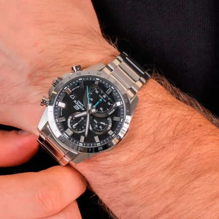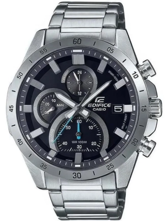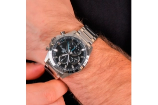 Наручные часы Casio Edifice (Касио эдифис) стильный хронограф по достоинству оценят современные мужчины. Стрелки и метки покрыты люминесцентным напылением (светятся в темноте). Циферблат с метками в виде штрихов. Часы-хронограф с секундомером точностью 1 сек и временем измерения 10мин. 12-ти и 24-х часовой формат времени. Ретроградный указатель минутной стрелки хронографа. Заводная головка с защитой. Задняя крышка с винтовым фиксатором. Батарея рассчитана на 3 года. Стальной браслет с тройной раскладывающейся застежкой, расстегиваемой одним касанием. Стекло минеральное, водонепроницаемость 100WR.
