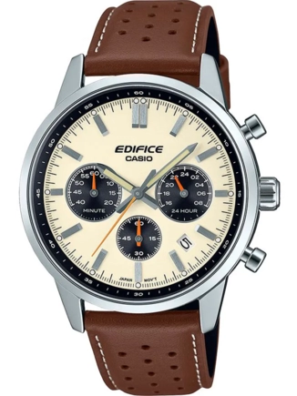 Наручные часы Casio Edifice (Касио эдифис) по достоинству оценят современные мужчины.  На данной модели отображается дата и время суток (24-х часовая шкала).  Секундомер с точностью показаний 1с и временем измерения 1ч.  Стрелки покрыты люминесцентным напылением (светятся в темноте). Циферблат с метками в виде штрихов. Заводная головка с защитой. На корпус нанесено стойкое PVD покрытие. Кожаный ремешок.  Сферическое минеральное стекло, водонепроницаемость 100WR.