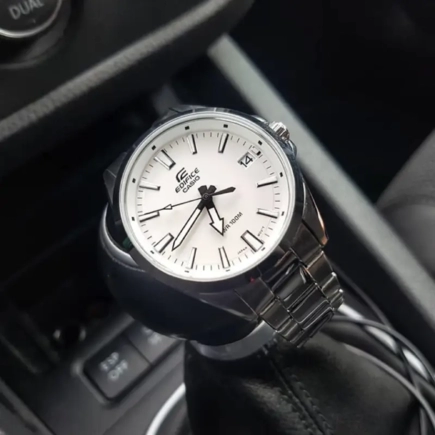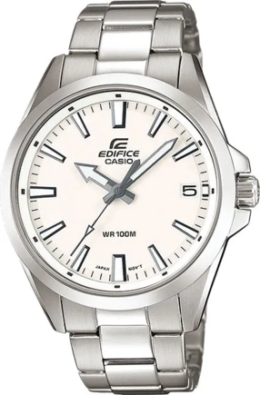 Наручные часы Casio Edifice (Касио Эдифис) по достоинству оценят современные мужчины. Будут отлично смотреться как с деловым костюмом, так и с повседневной одеждой. Стрелки и метки покрыты люминесцентным напылением (светятся в темноте). Циферблат с метками в виде штрихов. На данной модели отображается дата. Заводная головка с защитой. Задняя крышка с винтовым фиксатором. Стальной браслет с тройной раскладывающейся застежкой, расстегиваемой одним касанием. Стекло минеральное, устойчивое к повреждениям и царапинам. Водонепроницаемость 100WR.