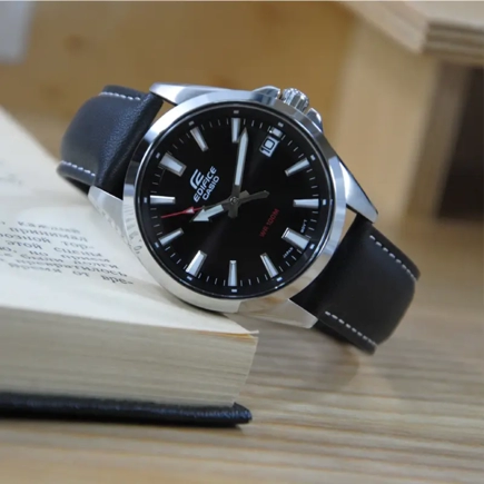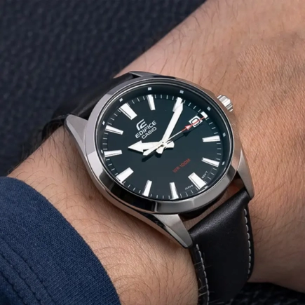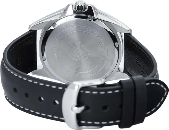 Наручные часы Casio Edifice (Касио Эдифис) по достоинству оценят современные мужчины. Будут отлично смотреться как с деловым костюмом, так и с повседневной одеждой. Стрелки и метки покрыты люминесцентным напылением (светятся в темноте). Циферблат с метками в виде штрихов. На данной модели отображается дата. Заводная головка с защитой. Задняя крышка с винтовым фиксатором. Ремешок из высококачественной натуральной кожи сочетает в себе долговечность, стиль и максимальный комфорт. Стекло минеральное, устойчивое к повреждениям и царапинам. Водонепроницаемость 100WR.