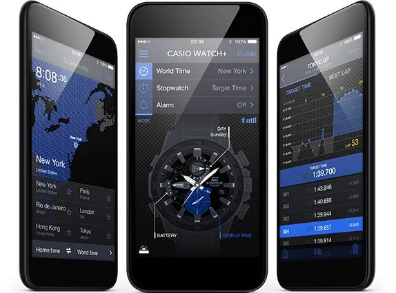 Часы-хронограф с секундомером и тахиметром. Секундомер с точностью показаний 1/20с и временем измерения 24ч. Приложение CasioWatch+ в смартфоне позволяет следить за временем любимой команды в Формуле I, а также отслеживать скорость болида на выбранной трассе.