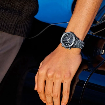 Часы-хронограф с секундомером с точностью показаний 1с и временем измерения 30мин. 12-ти и 24-х часовой формат времени. Карбоновый циферблат с метками в виде штрихов. Окошко даты находится в положении 4 часа.