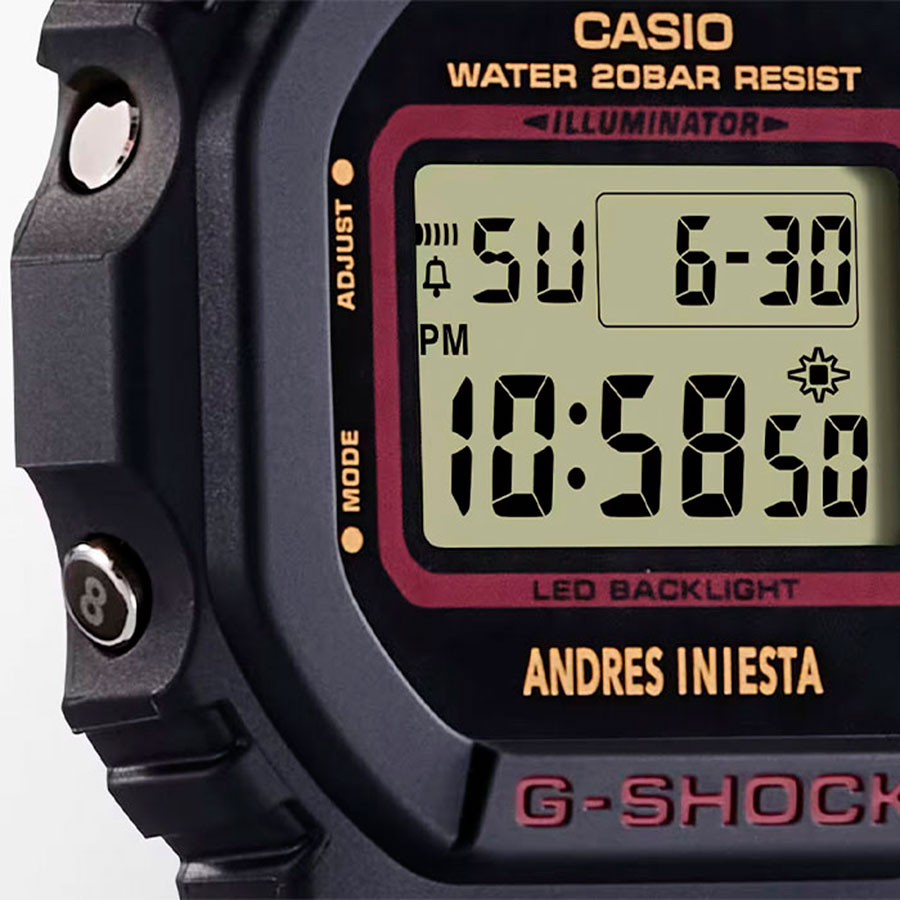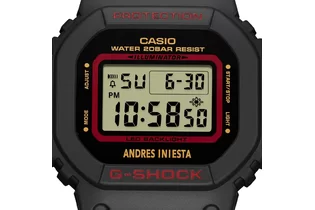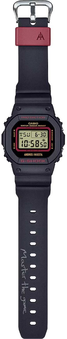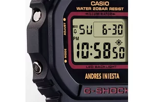 Модель G-Shock x Andres Iniesta является коллаборацией Casio G-Shock и легендарного испанского футболиста Андреса Иньесты (Andres Iniesta). На одной из кнопок выгравирована цифра «8» в знак уважения к его знаменитому номеру на футболке. Противоударный корпус защищает механизм от ударов и вибрации. Электролюминесцентная подсветка освещает весь циферблат, после отпускания кнопки свечение продолжается еще некоторое время. 12-ти и 24-х часовой формат времени. Секундомер с двумя точностями показаний: 1/100с (до 1ч) и 1с (после 1ч) и временем измерения 24ч. Сплит-хронограф. Таймер обратного отсчета от 1мин до 24ч с автоповтором. Типы сигналов: ежедневный, ежемесячный, каждый день определенного месяца, на определенную дату. Световая индикация сигнала. Корпус пластик. Циферблат ЖК. Браслет пластиковый. Водозащита 200WR. Стекло минеральное. Календарь автоматический: число, день недели, месяц (до 2099г).