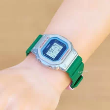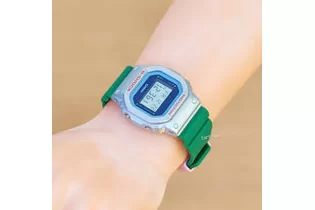 Яркий и стильный релиз в серебристом корпусе на зеленом ремешке с необычным миррор-циферблатом.
