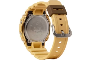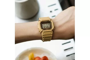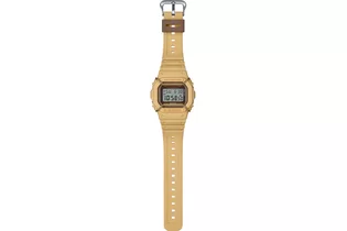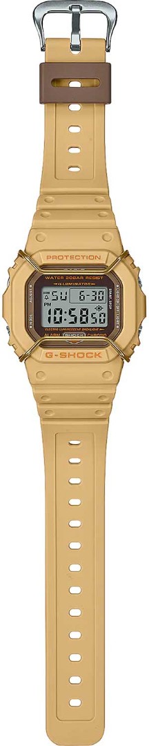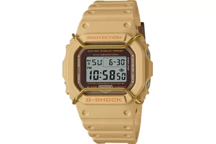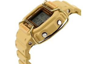 Перед вами редкий лимитированный релиз конца 2022 года из олдскульной серии G-SHOCK DW-5600 в матовом песочном корпусе с коричневой рамкой циферблата и металлическим протектором дисплея золотого оттенка!