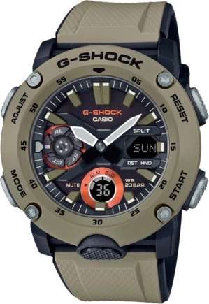 Противоударный пластиковый корпус с карбоновыми волокнами более прочный и в то же время более легкий. Этот же материал защищает внутренний модуль от повреждений и деформаций при ударах. Улучшена ударопрочность конструкции кнопок, что устраняет необходимость во внешних защитных накладках. Многокомпонентный циферблат состоит из цифровых окошек указателей числа и дня недели, а также индикатора режима работы часов, который расположен в позиции 9 часов и выполнен в виде пропеллера.