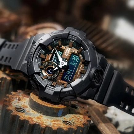 Надежные часы Casio G-Shock (Касио Джи Шок) с цифровой+стрелочной индикацией времени, для любителей активного образа жизни. Цвет циферблата вдохновлен текстурой ржавого металла, который отлично дополняет базовый черный цвет модели.