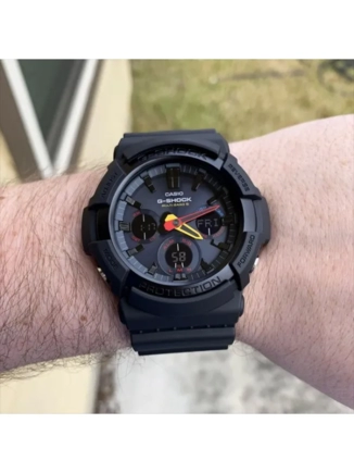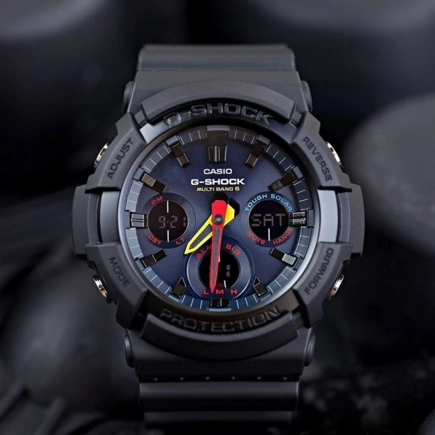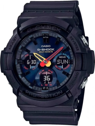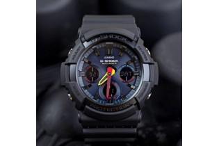 Обновленная расцветка в серии G-SHOCK GAW-100 в минималистичном черном корпусе с яркими красно-желтыми стрелками и деталями циферблата. В Casio эту расцветку называют Neo Tokyo, именно неоновыми огнями ночной столицы Японии, были вдохновлены дизайнеры бренда при создании этой модели.