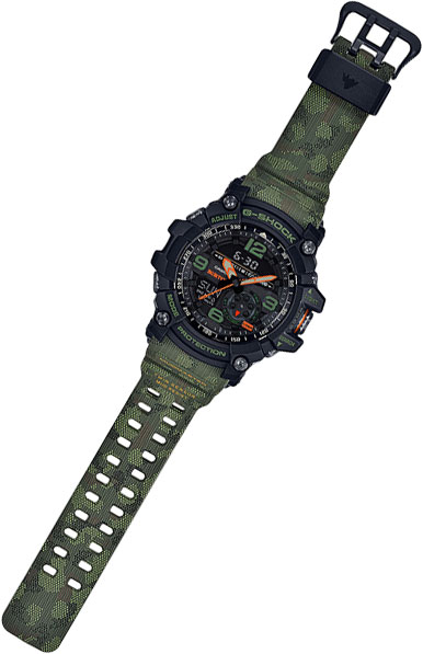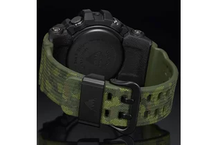 Минеральное стекло устойчивое к возникновению царапин. Люминесцентный состав на стрелках и часовых метках с ярким послесвечением даже после кратковременного воздействия света. Литая задняя крышка из нерж. стали с гравировкой соединена с корпусом 4 винтами. Ремешок из полимерного материала, поверхность с тиснением имитирующем грубую прочную ткань, стальная застежка с двойным шипом, фиксирующие кольцо с логотипом коллекции G-Shock.