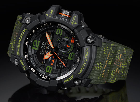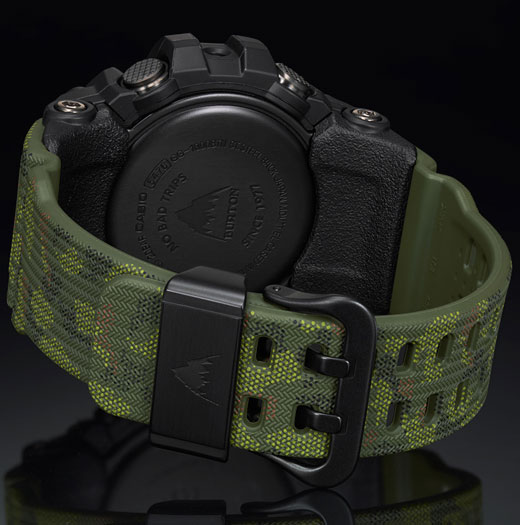 Модель обладает черным корпусом и камуфляжным ремешком со знаменитой фешн-расцветкой “Duck Camo”. На циферблате также преобладает цвет хаки, а рядом с логотипом Casio нанесет логотип Burton.