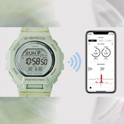 Синхронизация со смартфоном при помощи Bluetooth®. При подключении к смартфону часы автоматически корректируют текущее время, копируют настройки мирового времени более чем для 300 городов. Функции поиска телефона, отключения/включения звука и энергосбережения. Индикатор заряда батареи.