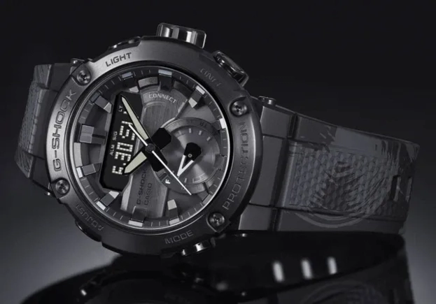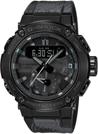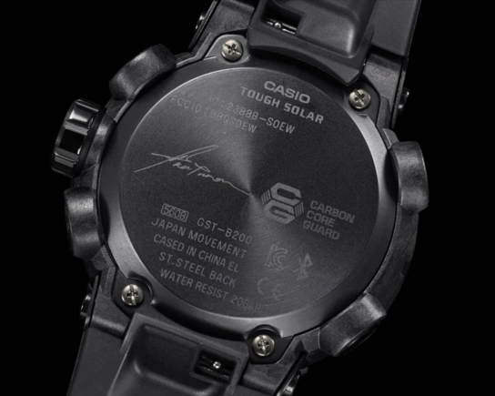 Противоударный корпус защищает механизм от ударов и вибрации. Ударопрочная конструкция Carbon Core Guard объединяет корпус и заднюю крышку в единый карбоновый моноблок. Раскладывающаяся застежка, расстегиваемая одним касанием. Предохранительная защелка на браслете препятствует случайному расстегиванию. Водозащита 200WR.