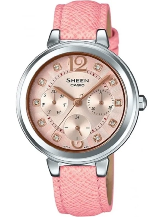 Женские японские наручные часы Casio Sheen (Касио шин) – это стильный аксессуар, который дополнит Ваш образ в любой ситуации. Оригинальный дизайн. Циферблат украшен кристаллами Swarovski. На данной модели отображается дата, день недели и время суток (24-х часовая шкала). Кварцевый механизм с высокой точностью +/- 20 сек в месяц. Минеральное стекло устойчивое к возникновению царапин. Корпус часов сделан из нержавеющей стали с высокими антикоррозийными свойствами. Кожаный ремешок, браслетная застежка, раскладывающаяся при нажатии на кнопки.Водонепроницаемость 50WR. Не снимая часов, Вы можете принимать душ или мыться в ванне.