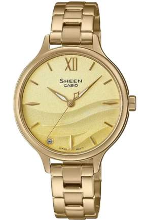 Японские часы Casio Sheen (Касио шин), кварцевый механизм с высокой точностью. Текстурный циферблат украшен кристаллом Swarovski. Стрелки покрыты люминесцентным напылением (светятся в темноте). На корпус и браслет нанесено стойкое PVD покрытие. Сапфировое стекло устойчивое к появлению царапин, обладающее высокой прозрачностью. Водозащита 50WR, позволит защитить корпус от случайных брызг или капель дождя. Корпуск из высококачественной стали на стальном браслете.